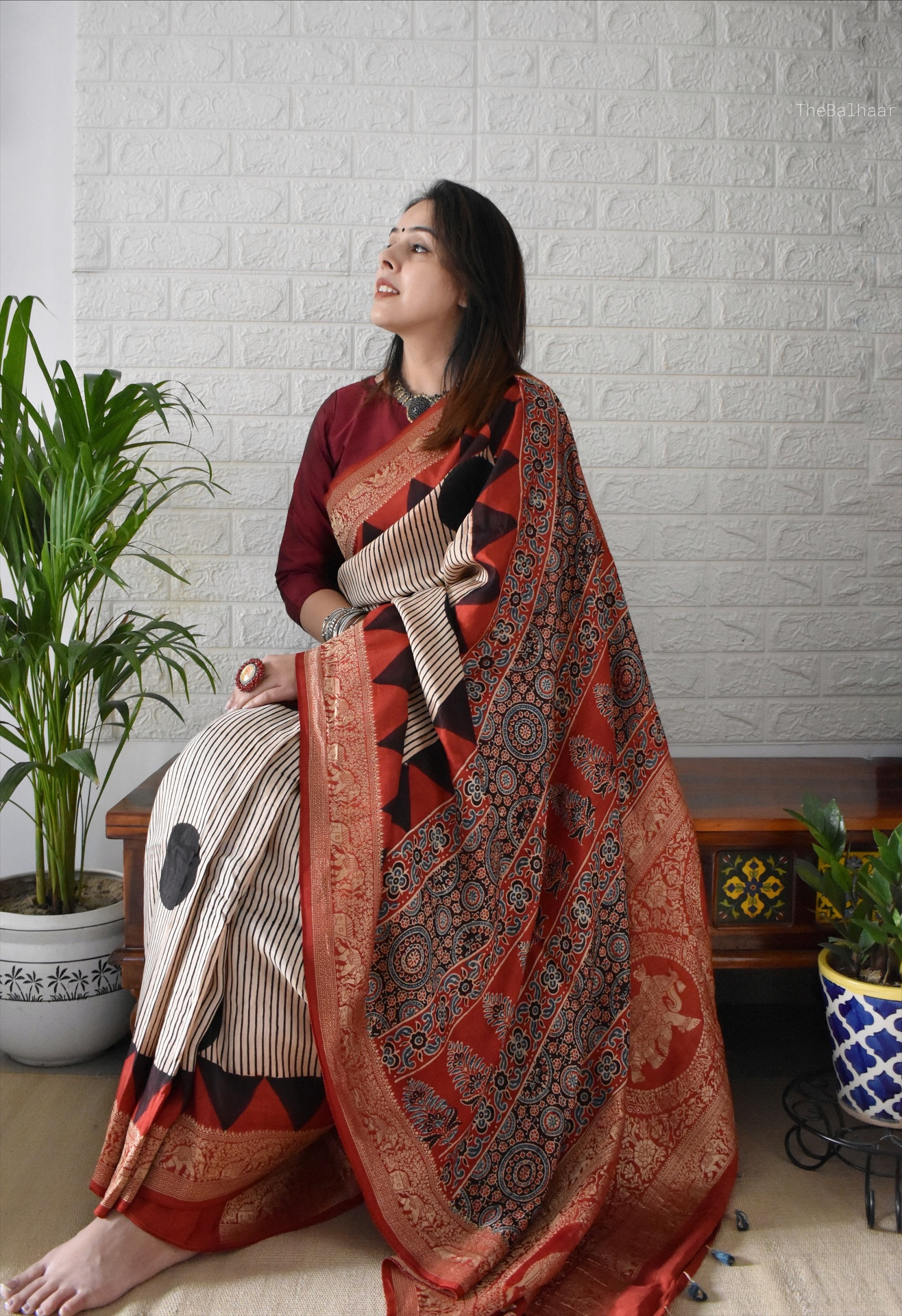 ⢠AJRAKH SAREES HOLD SLIGHT COLOUR IMPERFECTIONS HERE AND THERE DUE TO MANUAL PROCESS AND WILL NOT BE CONSIDERED AS DEFECTS.